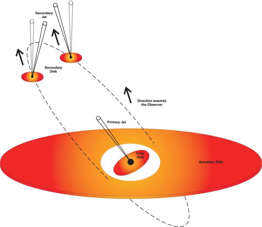 Yaklaşık 5 milyar ışık yılı uzaklıkta bulunan bu iki kara delik, 12 yıllık bir yörüngede birbirlerinin çevresinde dönüyor. Sistemdeki büyük kara delik, evrendeki en parlak gök cisimlerinden biri olan OJ 287 olarak adlandırılıyor ve Güneş’in 18 milyar katı kütleye sahip. Daha küçük olan kara delik ise neredeyse ışık hızında parçacıklar püskürten bir jet üretiyor. Bu jetin yönü zamanla değişiyor ve adeta salınan bir hortum ya da kuyruğunu sallayan bir köpek gibi davranıyor. Küçük kara deliğin kütlesinin de Güneş’in 150 milyon katı olduğu belirtiliyor.