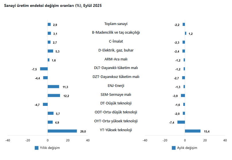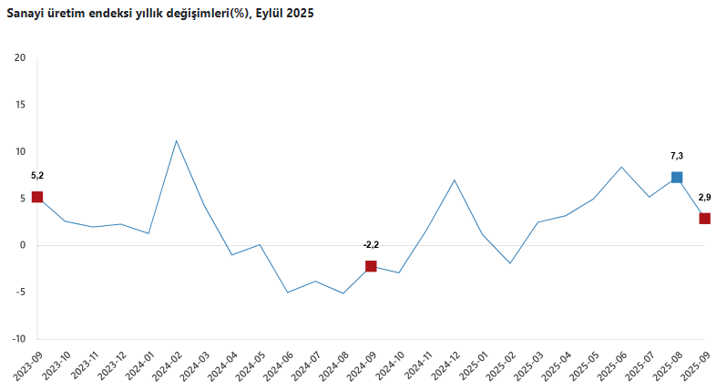 Türkiye İstatistik Kurumu (TÜİK) sanayi üretimi verilerini açıkladı. Buna göre sanayinin alt sektörleri (2021=100 referans yıllı) incelendiğinde, 2025 yılı Eylül ayında madencilik ve taş ocakçılığı sektörü endeksi bir önceki yılın aynı ayına göre yüzde 3,1 arttı, imalat sanayi sektörü endeksi yüzde 2,7 arttı ve elektrik, gaz, buhar ve iklimlendirme üretimi ve dağıtımı sektörü endeksi yüzde 5,3 arttı.