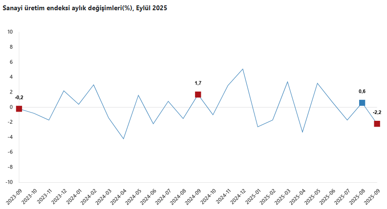 Sanayinin alt sektörleri incelendiğinde, 2025 yılı Eylül ayında madencilik ve taş ocakçılığı sektörü endeksi bir önceki aya göre yüzde 1,2 arttı, imalat sanayi sektörü endeksi yüzde 2,3 azaldı ve elektrik, gaz, buhar ve iklimlendirme üretimi ve dağıtımı sektörü endeksi yüzde 2,4 azaldı.